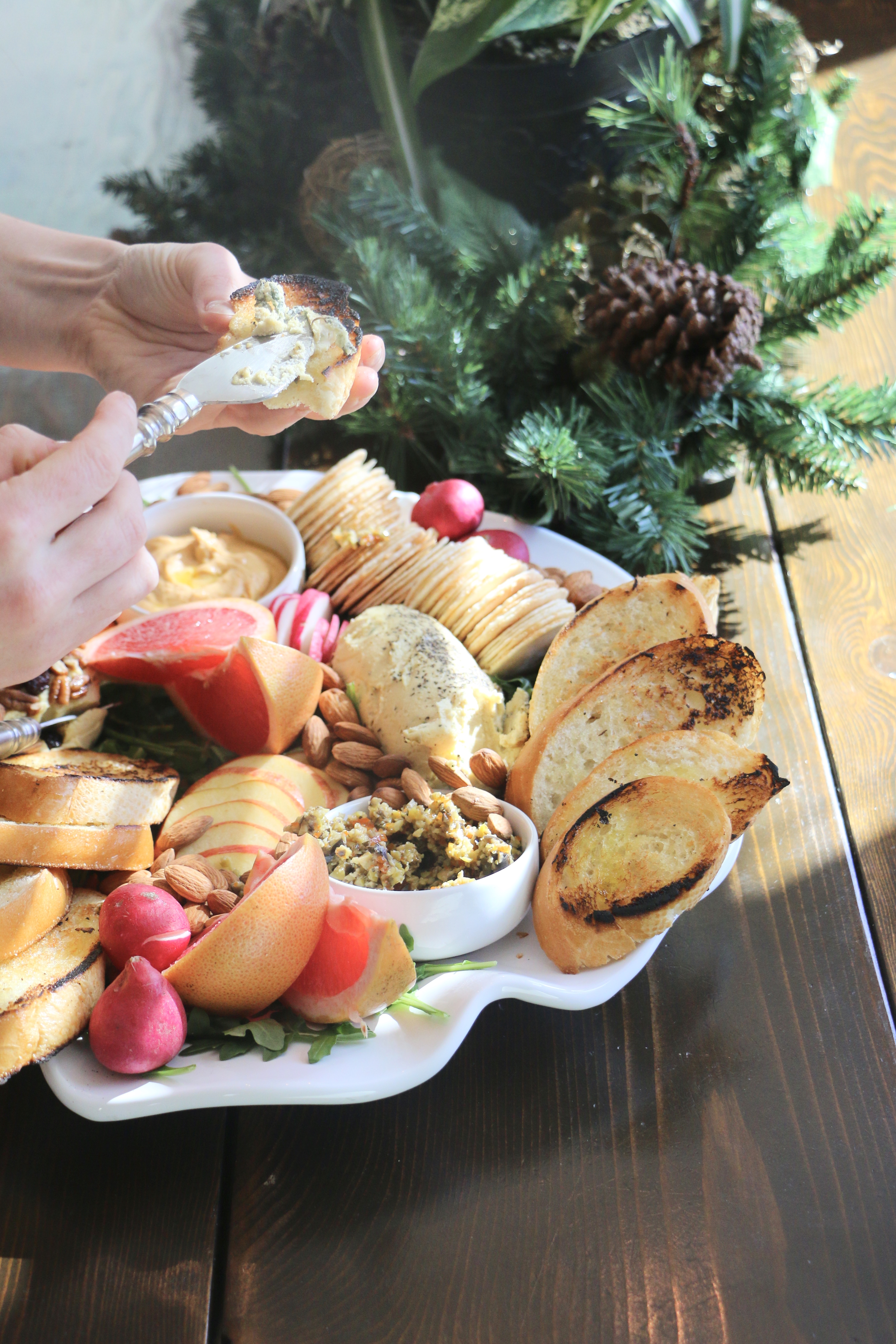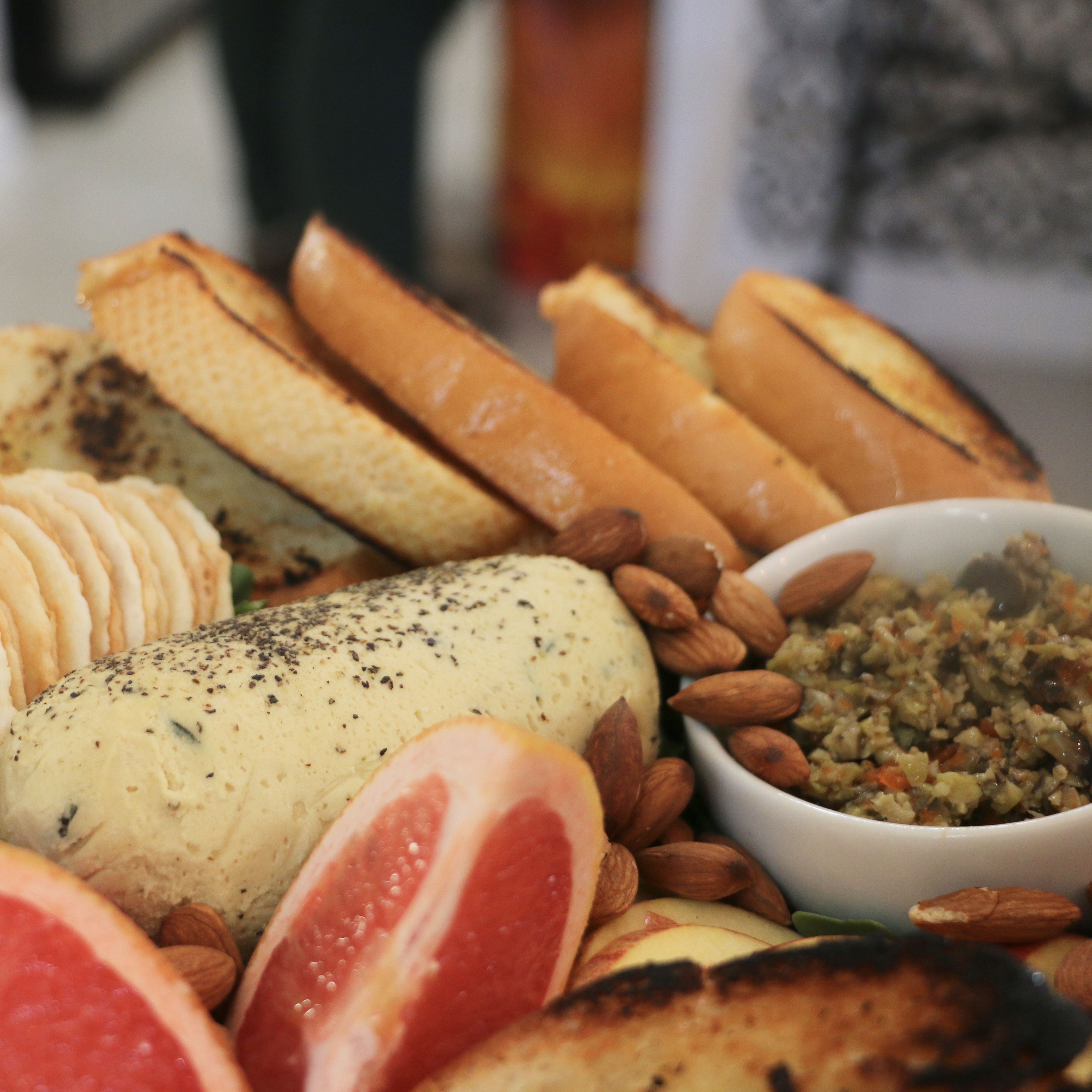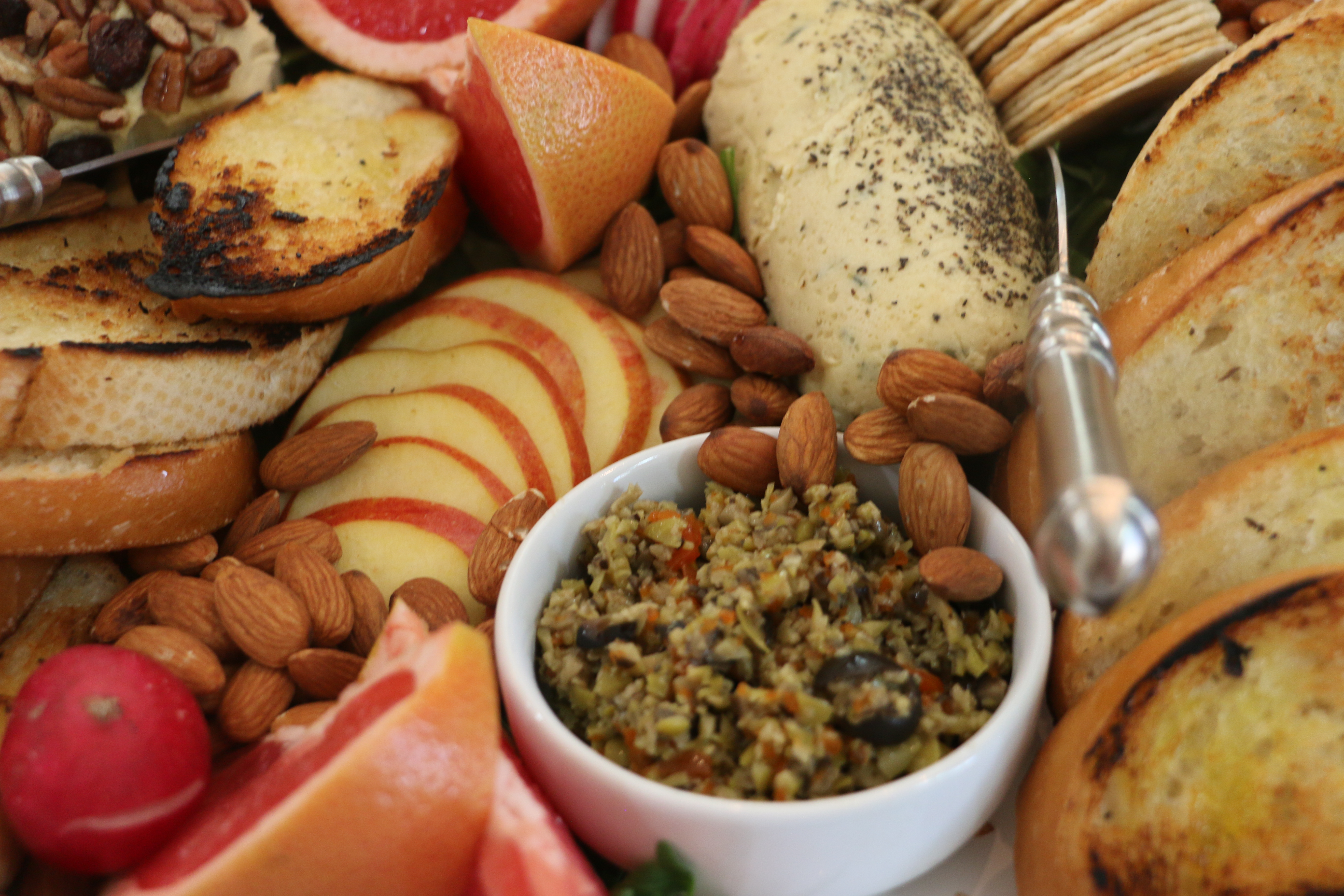 Half of this beauty are the two different cashew cheese’s and homemade tapenade (recipes below), the other half is the presentation (tips below) which I learned so much from my dear friend who owns Cultured by Colette in Austin, Texas. This beautiful soul owns a small business that curates beautifully styled grazing trays and tables for parties, events, etc. She also took all of these amazing photos to help show off my recipes!