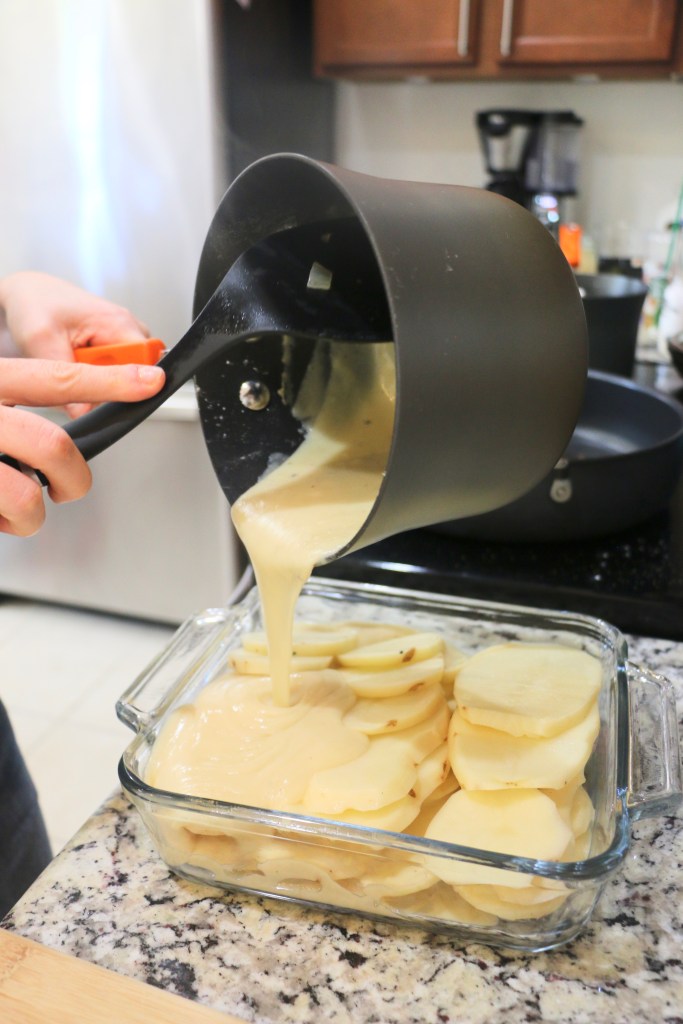 - Pour the sauce over the potatoes and put into the oven for 45 minutes, or until potatoes are fork tender.